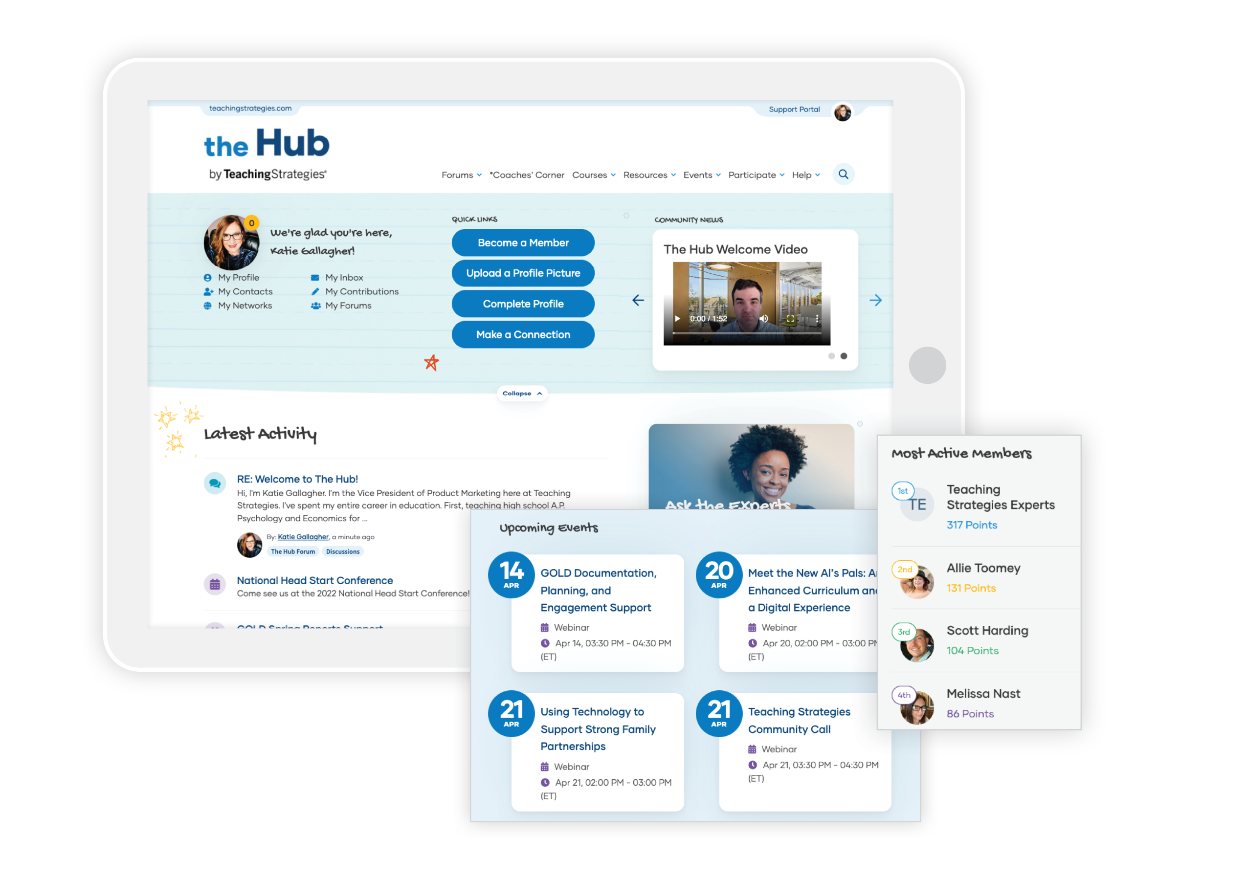 Engage, connect, and collaborate through discussion forums, community groups, and the open sharing of ideas in our new online professional development community, The Hub. Visit The Hub through the Teaching Strategies platform and get started today!