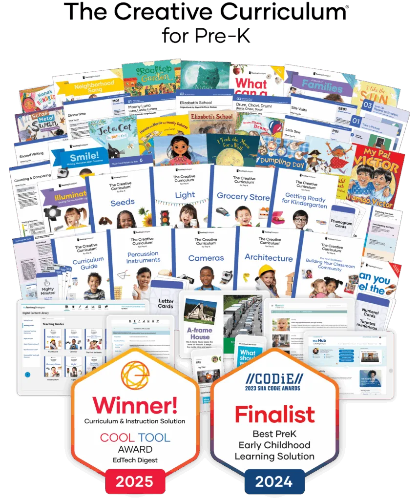 The Creative Curriculum balances teacher-planned and child-initiated learning, emphasizing responsiveness to children’s strengths, interests, needs, and learning styles. Nationally known for being forward-thinking, comprehensive, and rigorously researched, it helps teachers plan and implement content-rich, developmentally appropriate programs that support active learning and promote children’s progress in all developmental areas.
